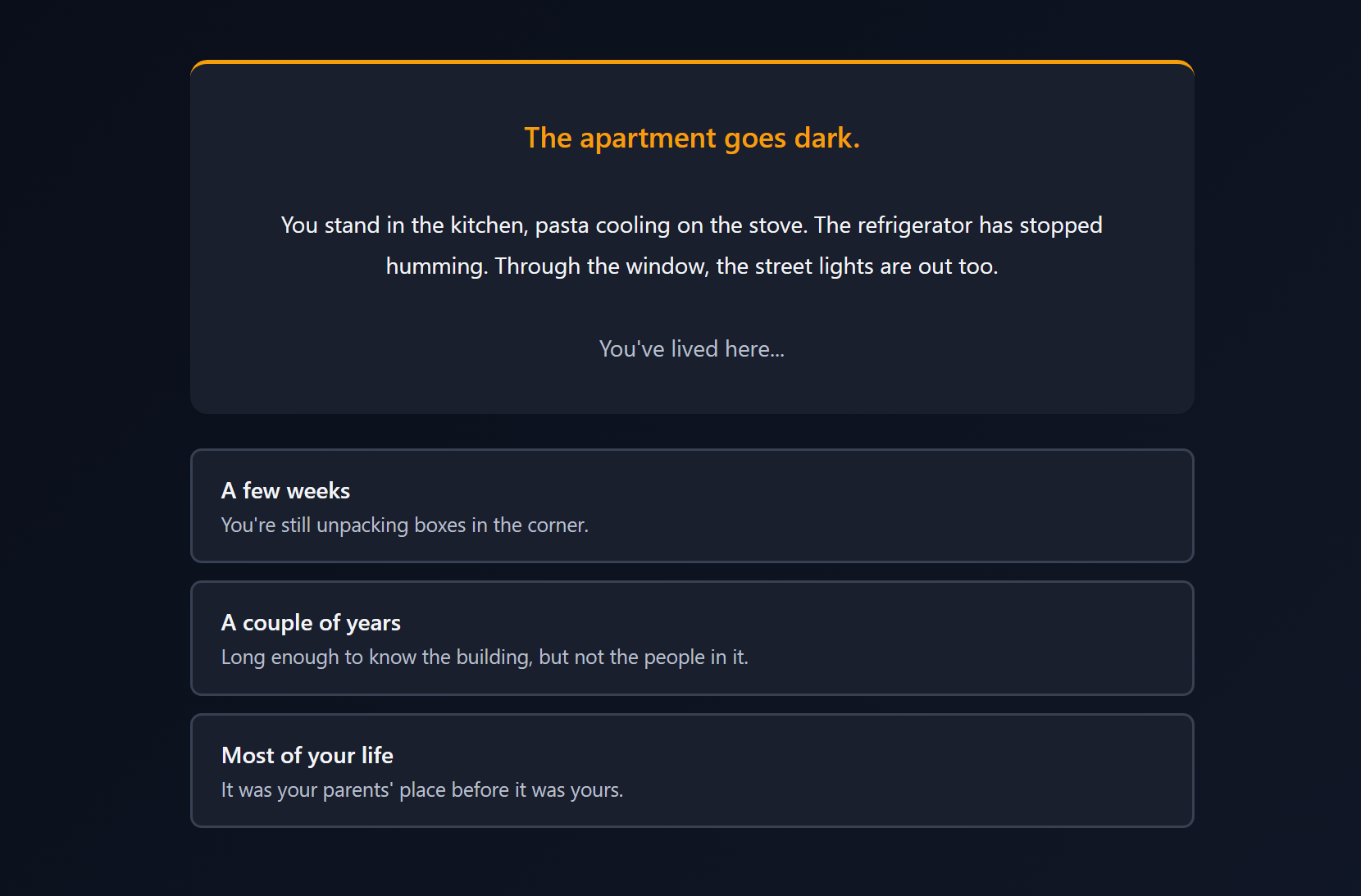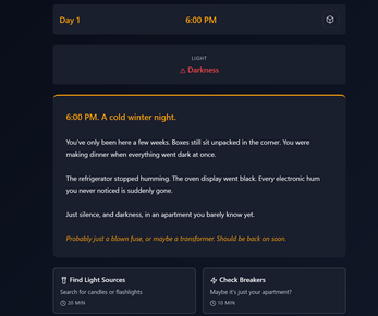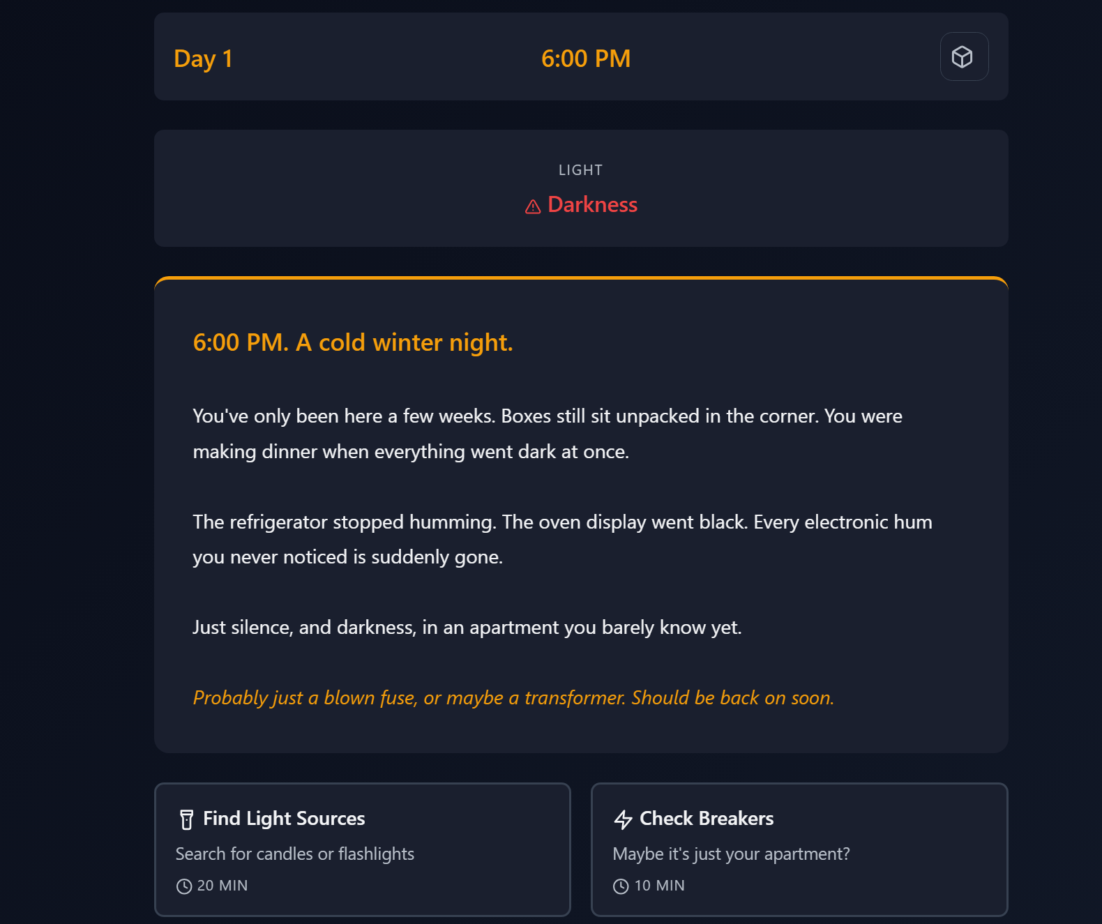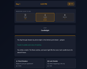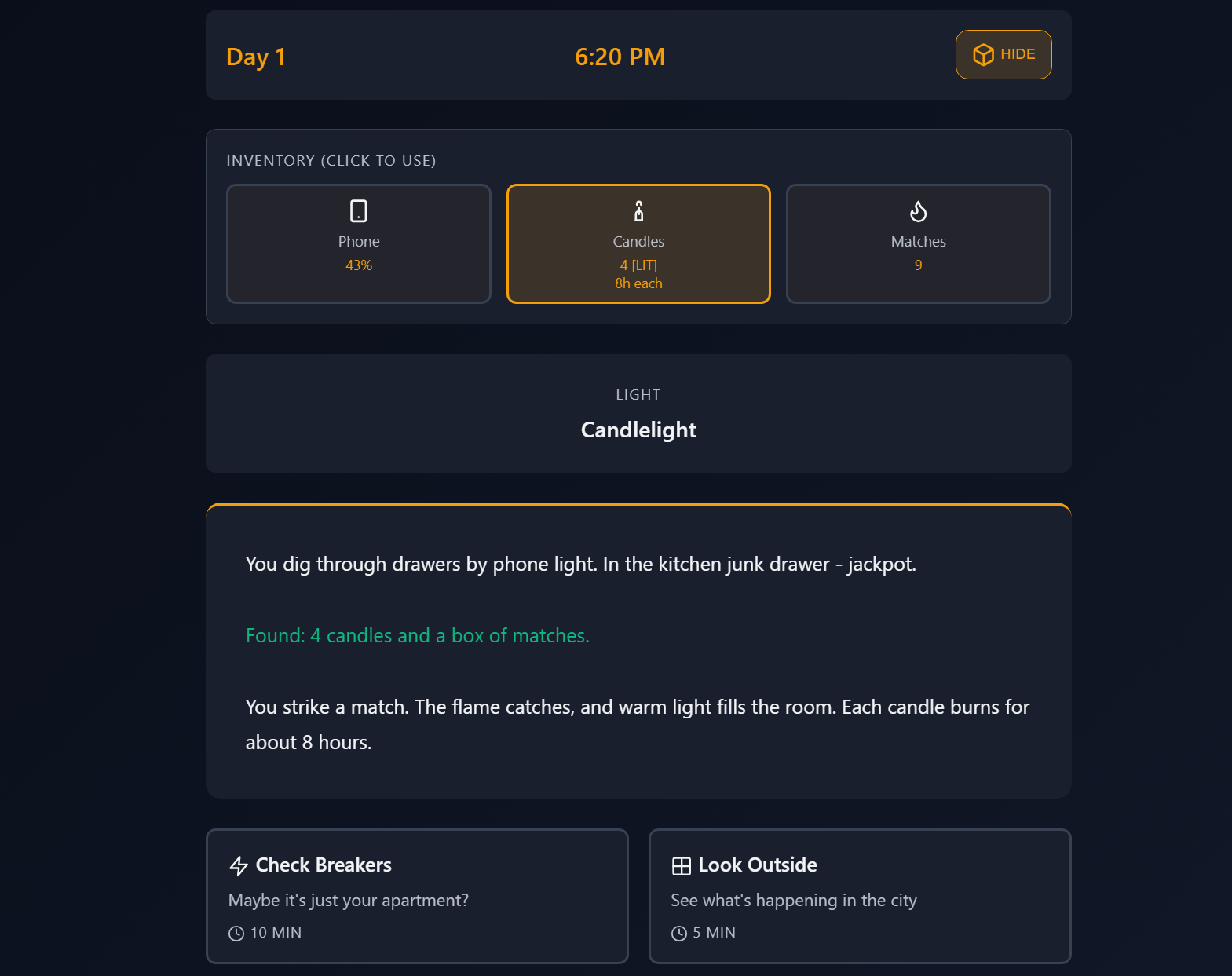 Interact with items in your inventory to see changes to the story, e.g. open your phone to read news or call emergency services (while your battery lasts), or light your candle (if you have matches left).