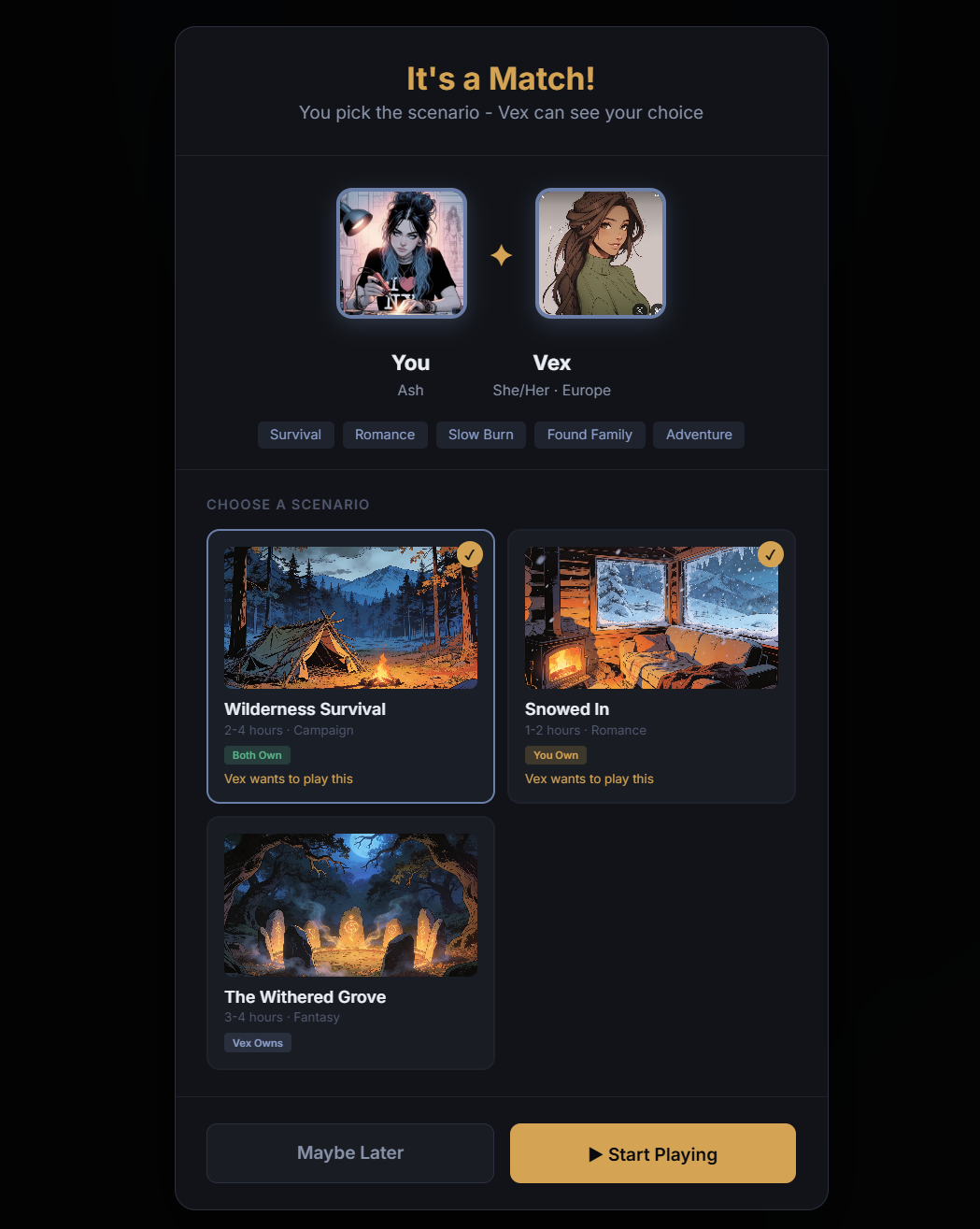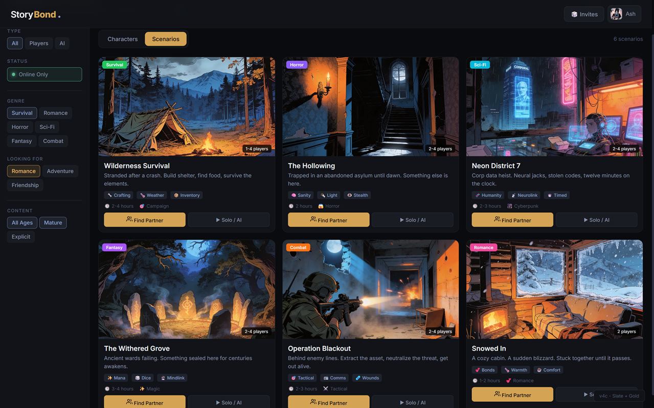 Play solo with AI companions, or find a partner and drop into scenarios together.