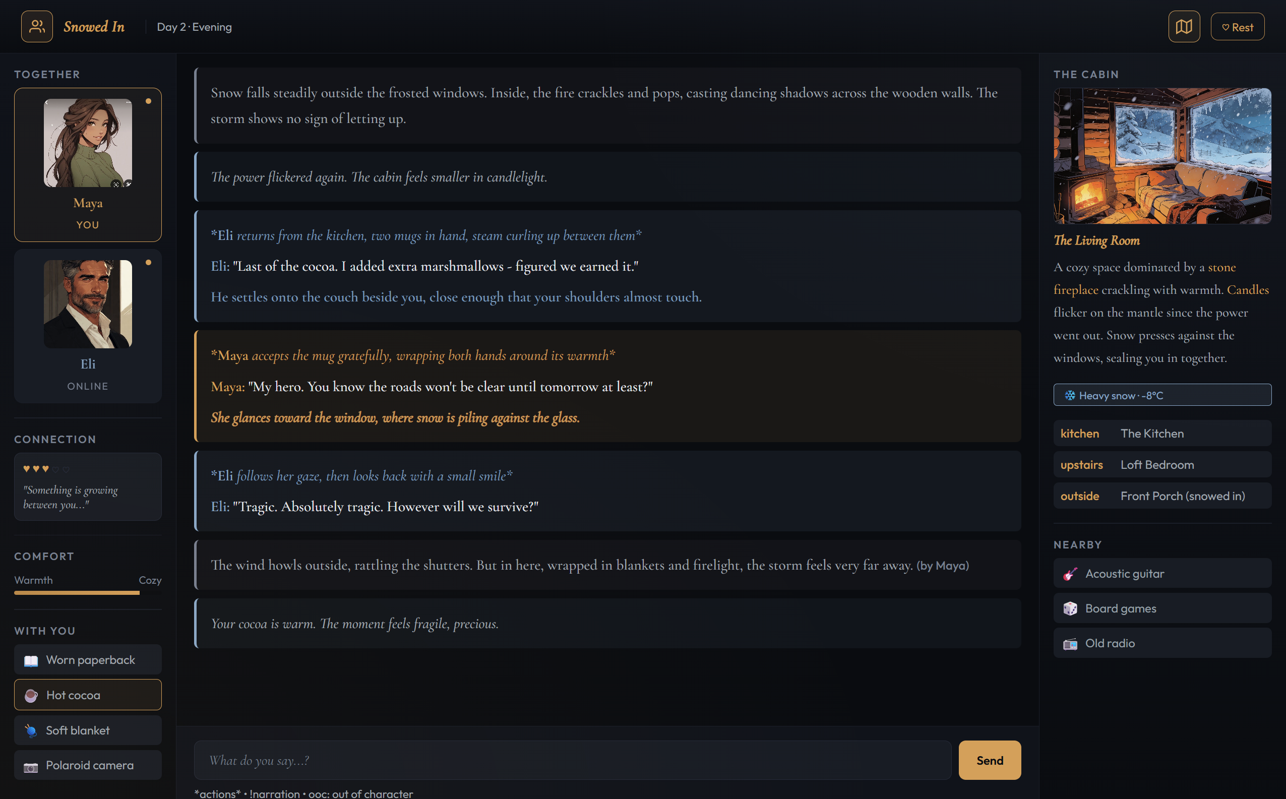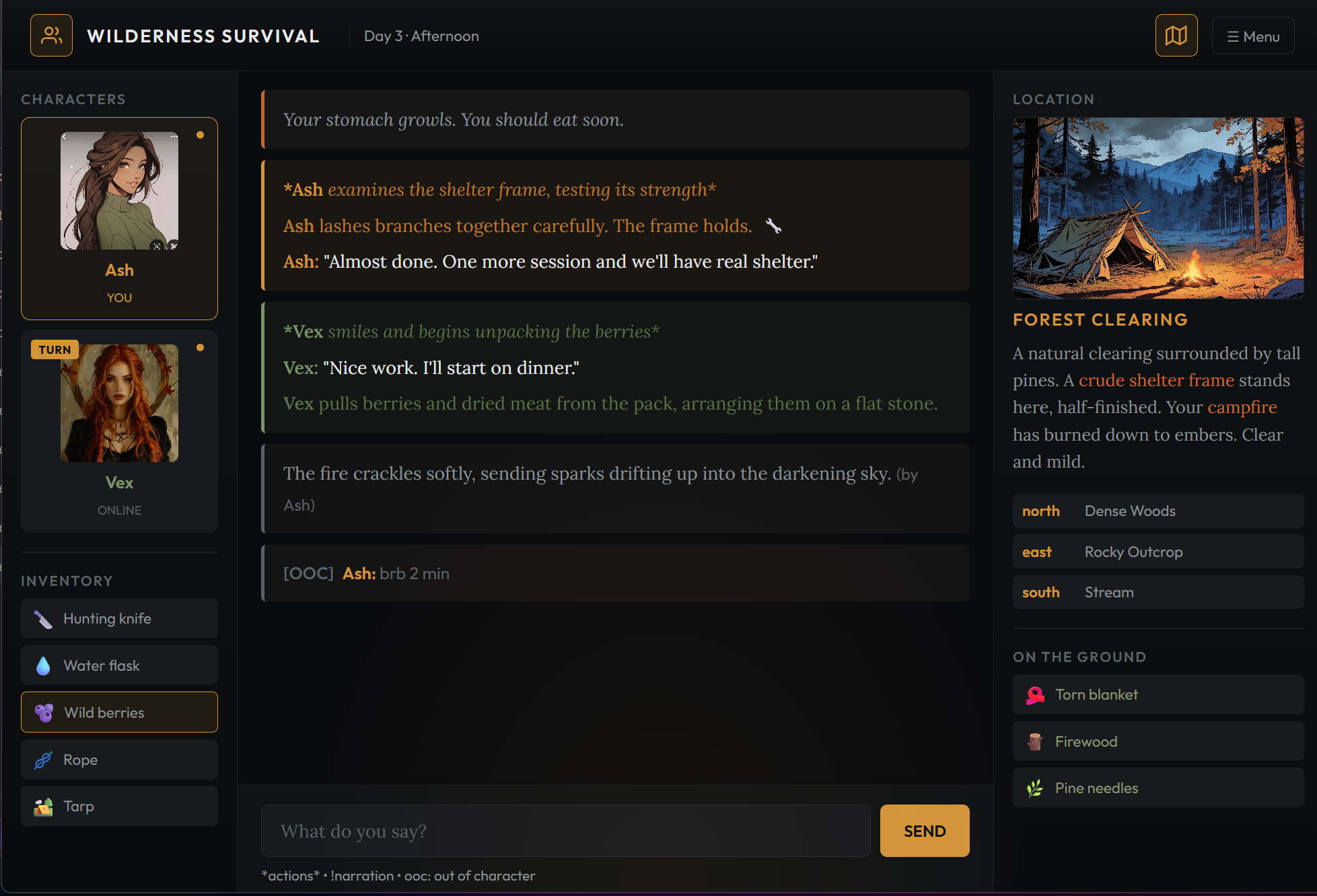 Survive a blizzard. Run a farm. Fight through a dungeon. Escape a space station. Build a homestead. Every scenario has working systems underneath - items degrade, resources deplete, weather shifts, choices ripple forward.